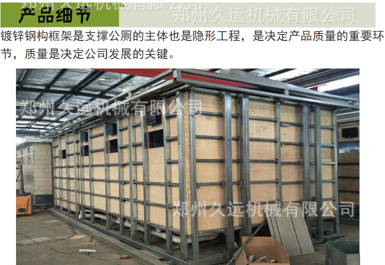 1、房體結(jié)構(gòu): 采用輕鋼龍骨結(jié)構(gòu),鋼材全部使用國家標(biāo)準(zhǔn)鍍鋅鋼材。根據(jù)房體的大小特選用國標(biāo)方管(50-100)焊接而成。鍍鋅管厚度為2.8mm,方管經(jīng)過除銹后進(jìn)行鍍鋅、防腐處理。這樣就會延長廁所使用壽命。